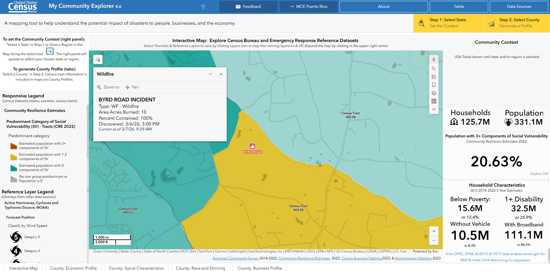 A good example comes from North Carolina. Using Community Explorer, users can click on a recent wildfire, such as the Byrd Road Incident, which was being fought as I was writing this column. Clicking on the incident shows that the fire was eventually contained on March 7 after burning 10 acres, but also the broader community context around it. It was a fairly small fire compared with many others on the map, but gives a good look at the kind of information that the Census maps can provide to both first responders and post-disaster aid workers.